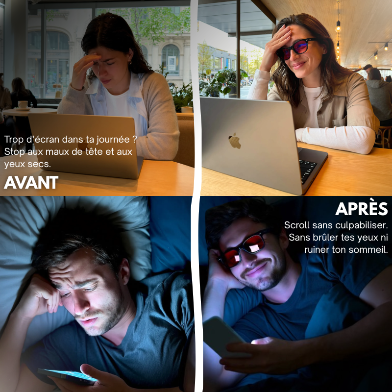 Les verres filtrent réellement la lumière bleue émise par toutes tes sources : laptop, smartphone, tablette, éclairage.
