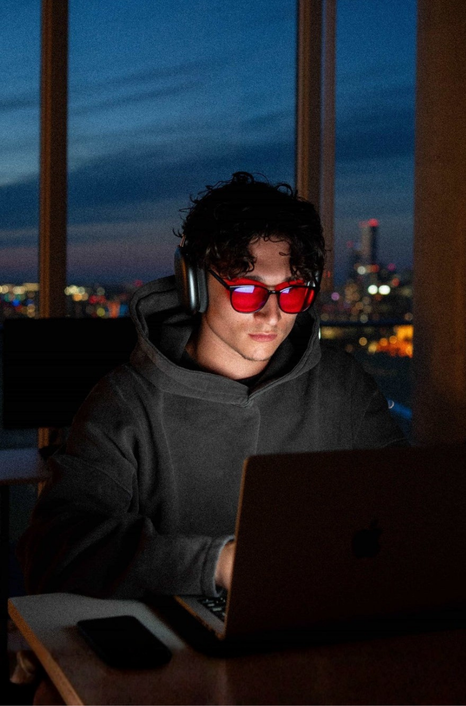 Un duo de verres complémentaires : orange pour le jour, rouge pour la nuit, afin de réduire la fatigue visuelle, améliorer la concentration et préserver ton sommeil.
